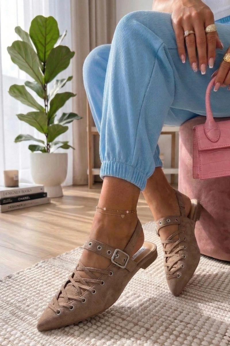 Karamelli värvi avatud kontsaga baleriinid nööpidega Seraphina