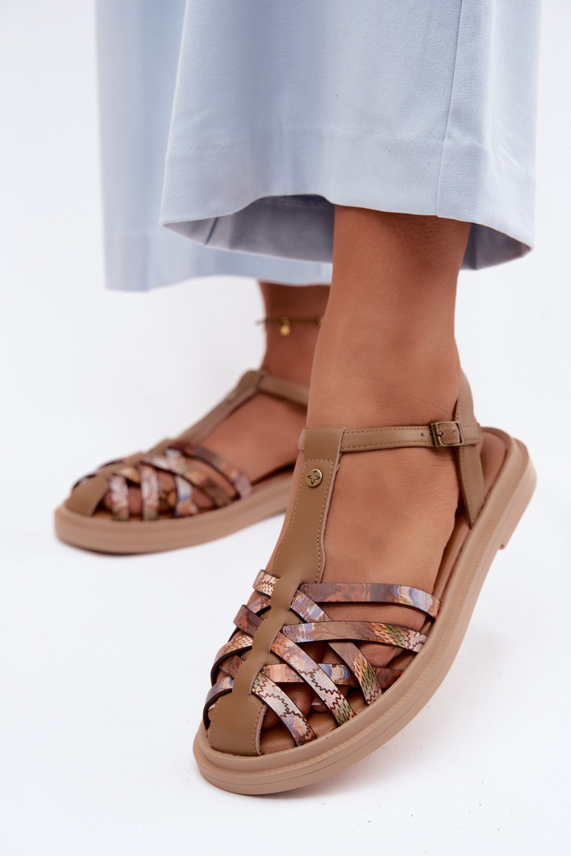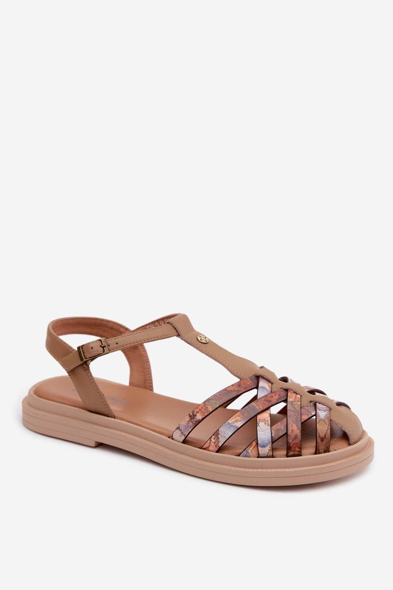 Nahkseotud lamedad sandaalid naistele rihmadega sandi värvuses