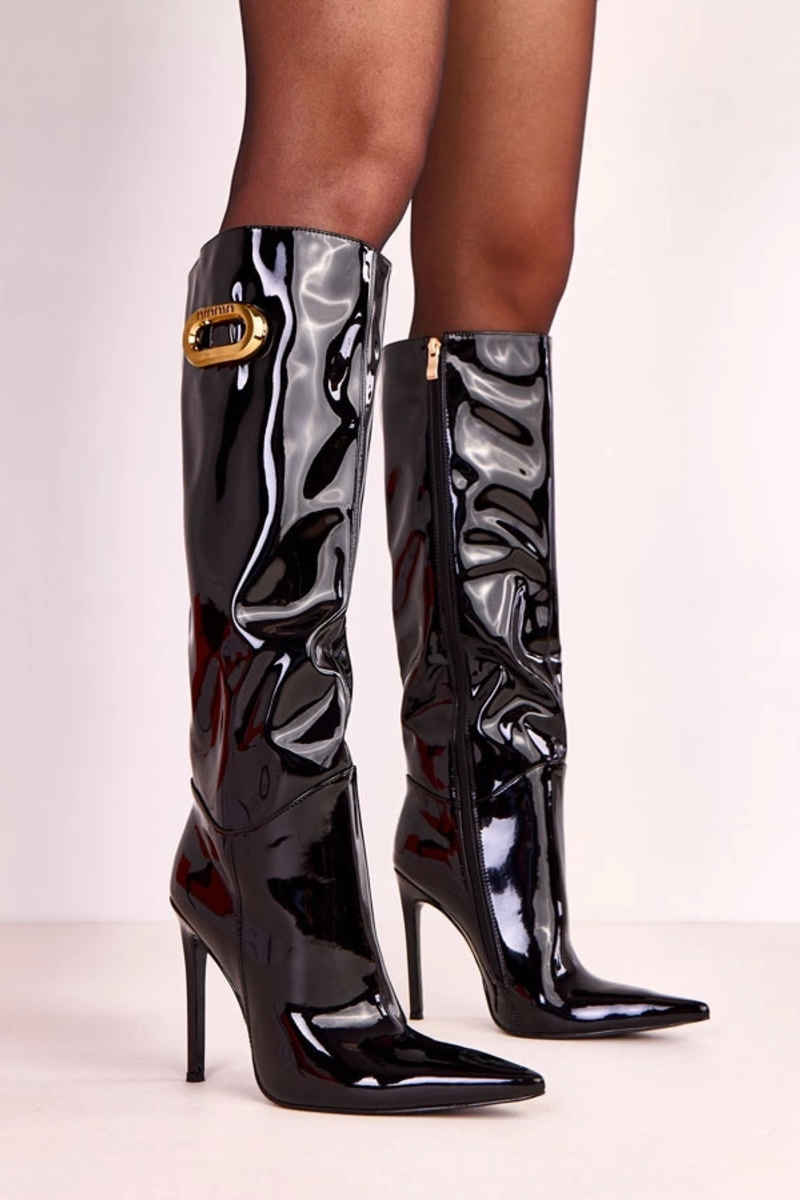 Mustad lakitud kõrged saapad kuldsete kaunistustega Herrera