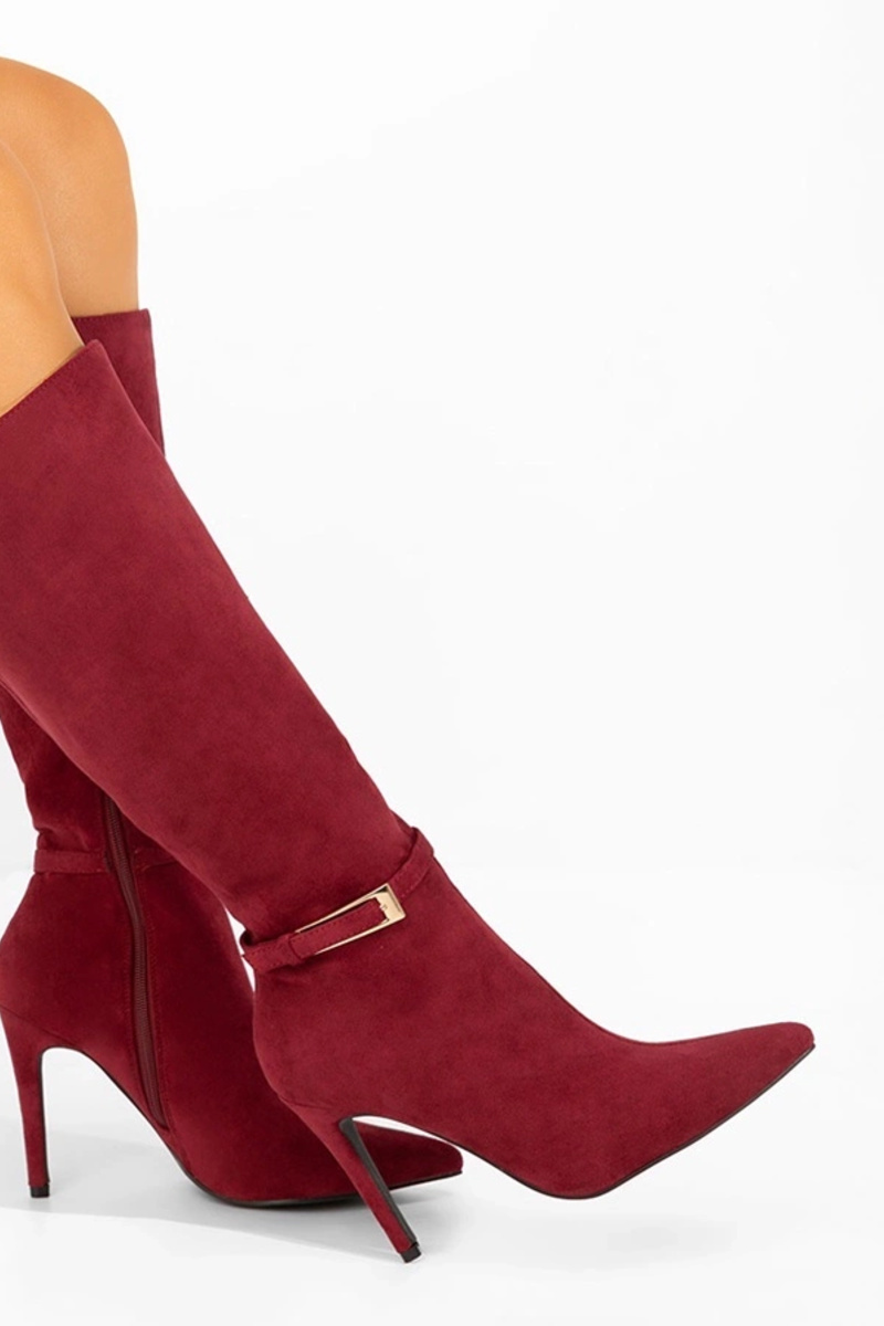 Bordo pika varrega saapad õhukese kontsaga dekoratiivse klambriga Arielle