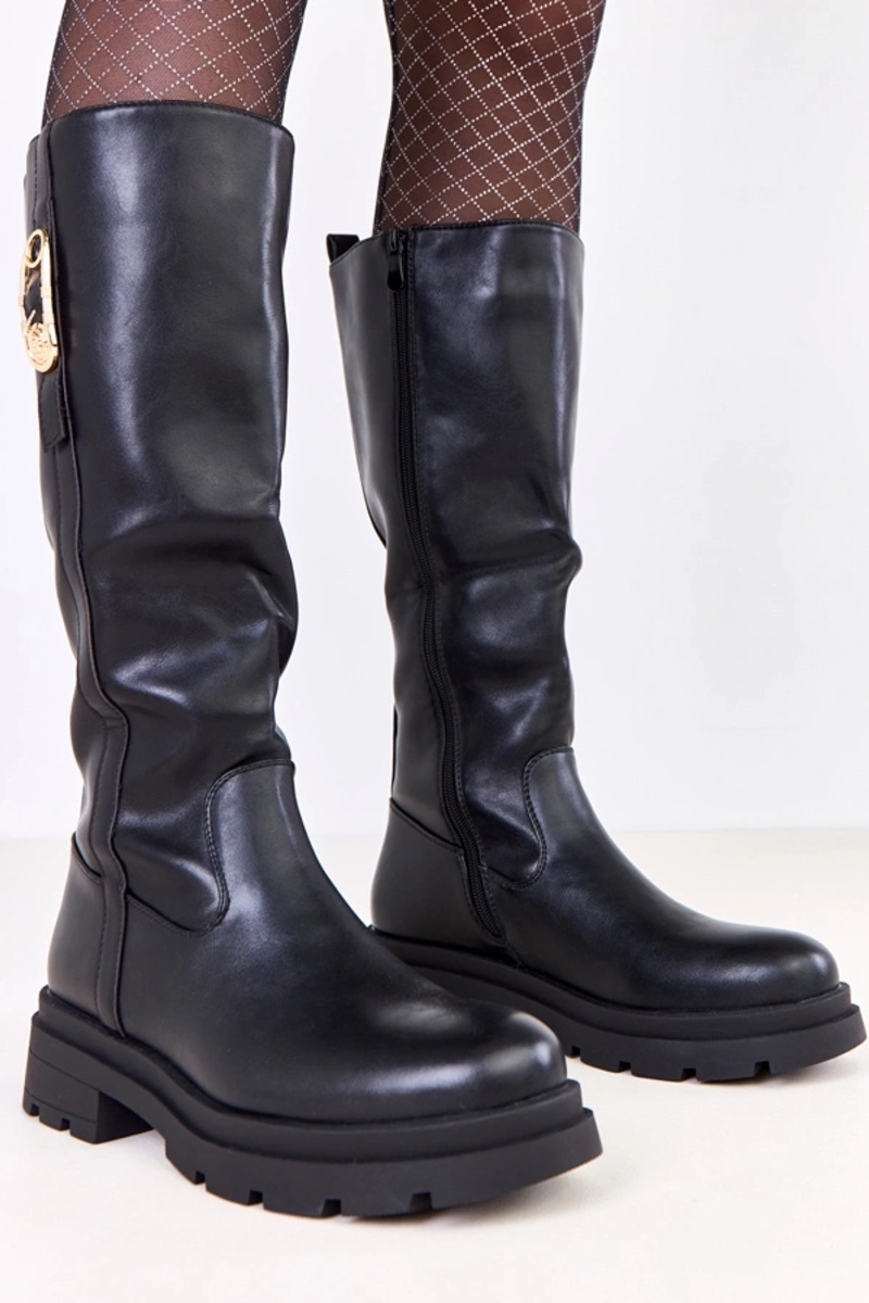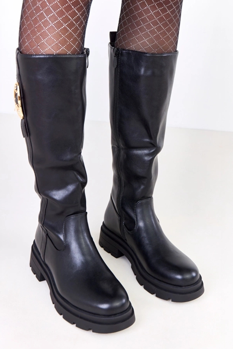 Mustad ökoloogilisest nahast saapad kuldse kaunistusega Meliros