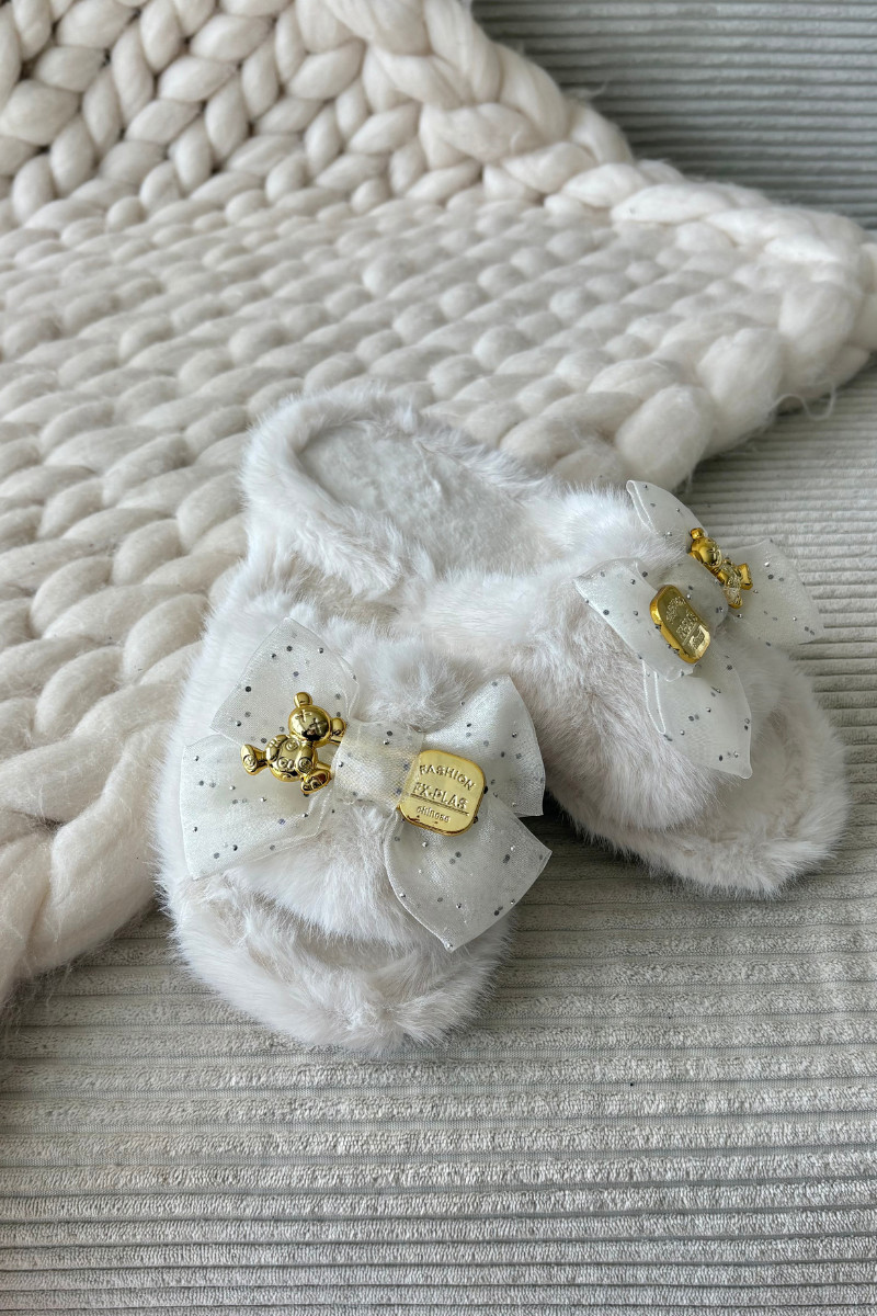 Elevandiluust värvi naiste sussid karusnahaga, lipsud ja kuldne kaunistus „Nolara"
