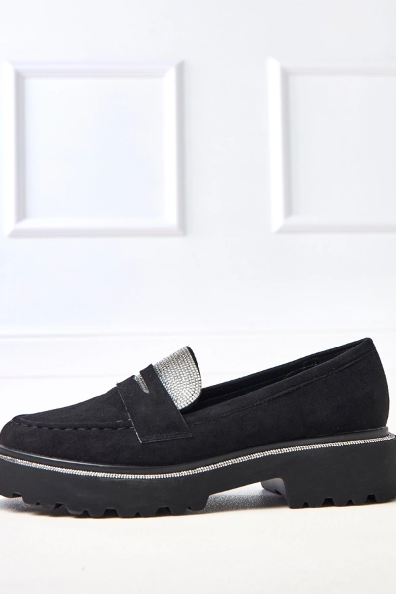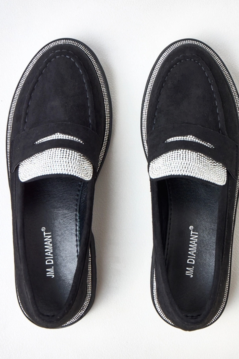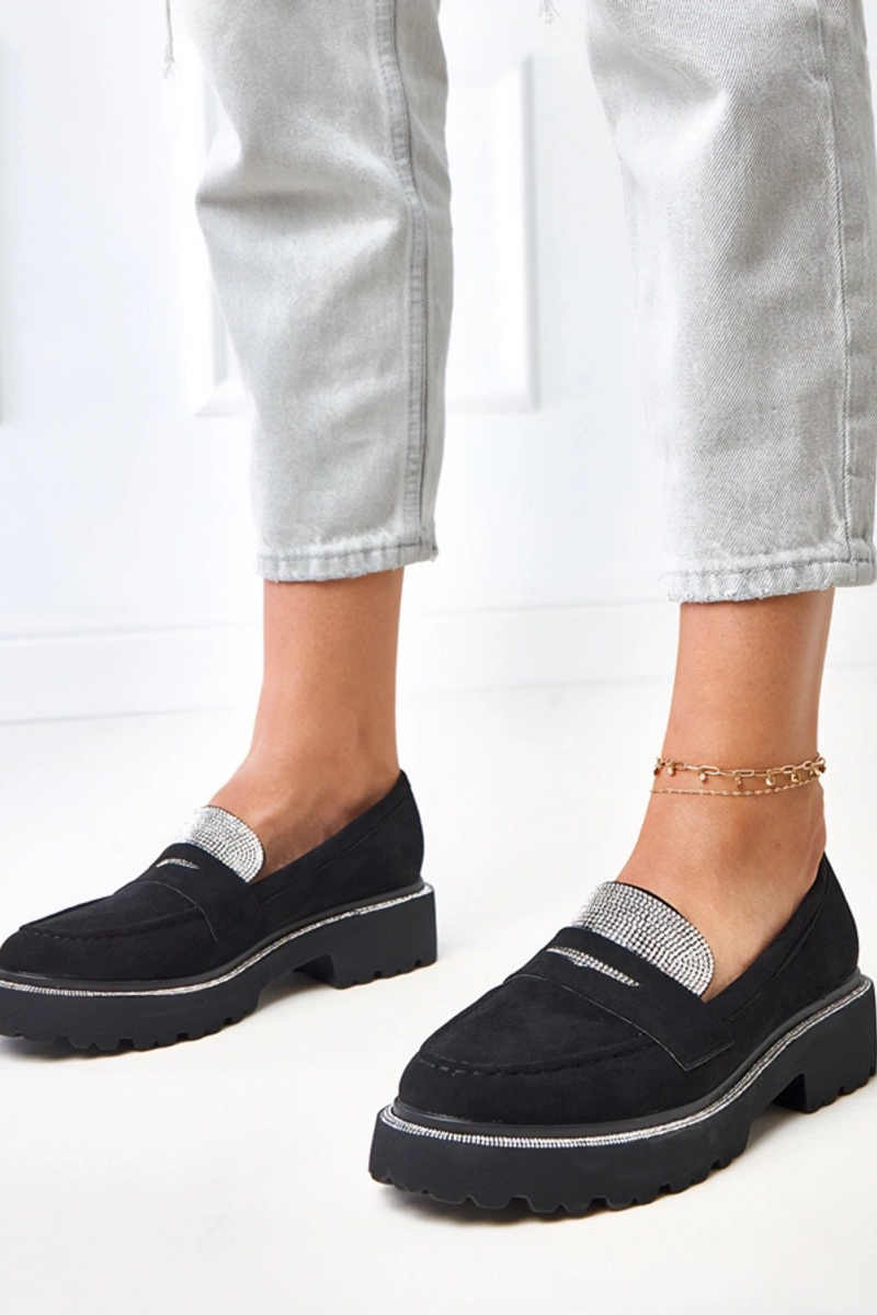 Mustad kunstnahast mokasiinid, kaunistatud tsirkonitega Kloren