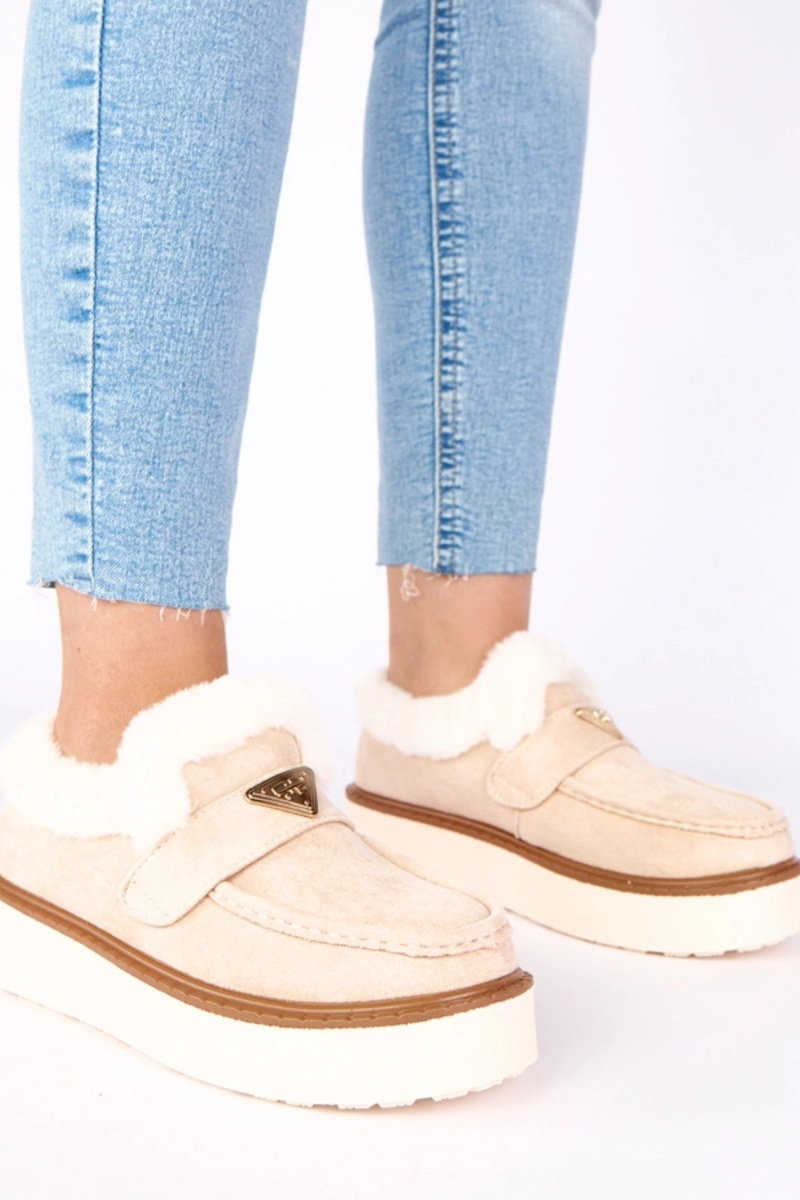 Helebeezid mokasiinid, soojustatud karvaga "Loafy"
