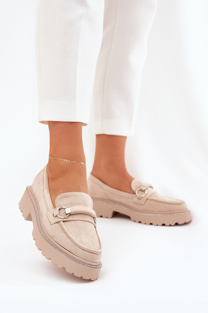 Naisten mokasiinid, kaunistatud tsirkonitega, liivavärvi