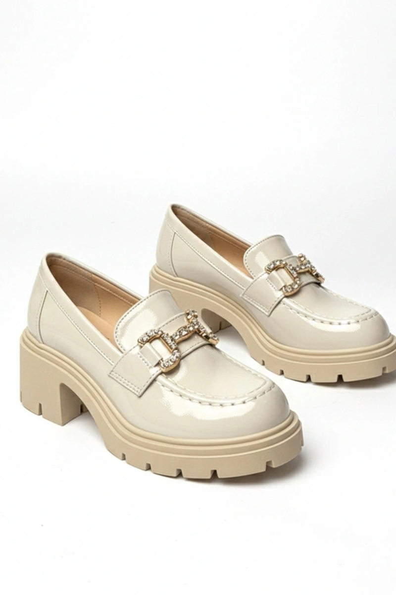 Kreemjad lakitud mokasiinid kontsaga ja tsirkonitega Paola