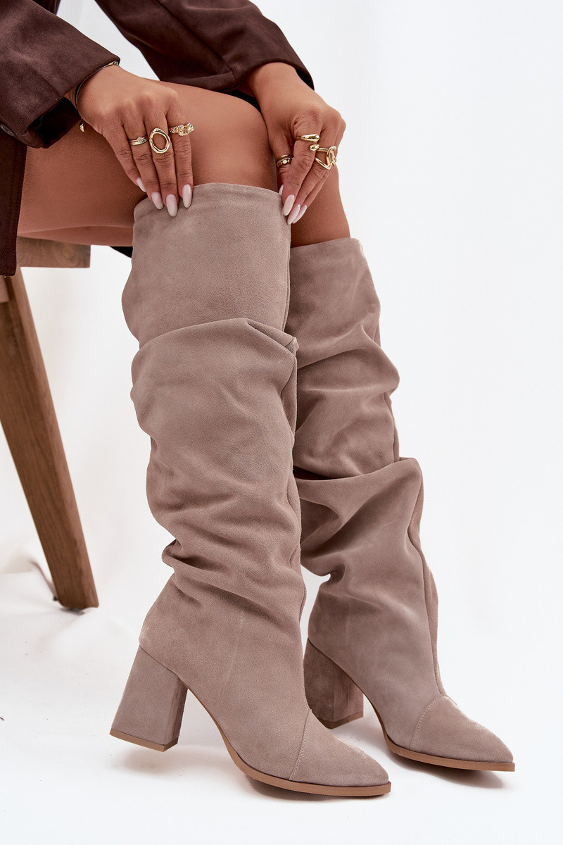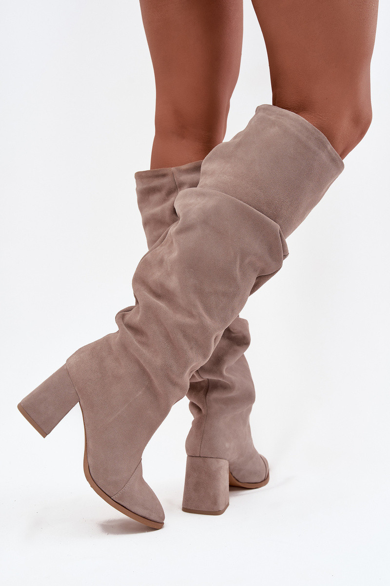 Kortsus pika säärega saapadPealturalnego seemisnakhsedu kõrge jämeda kontsaga voodriga Zazoo 4228 beeži värvi