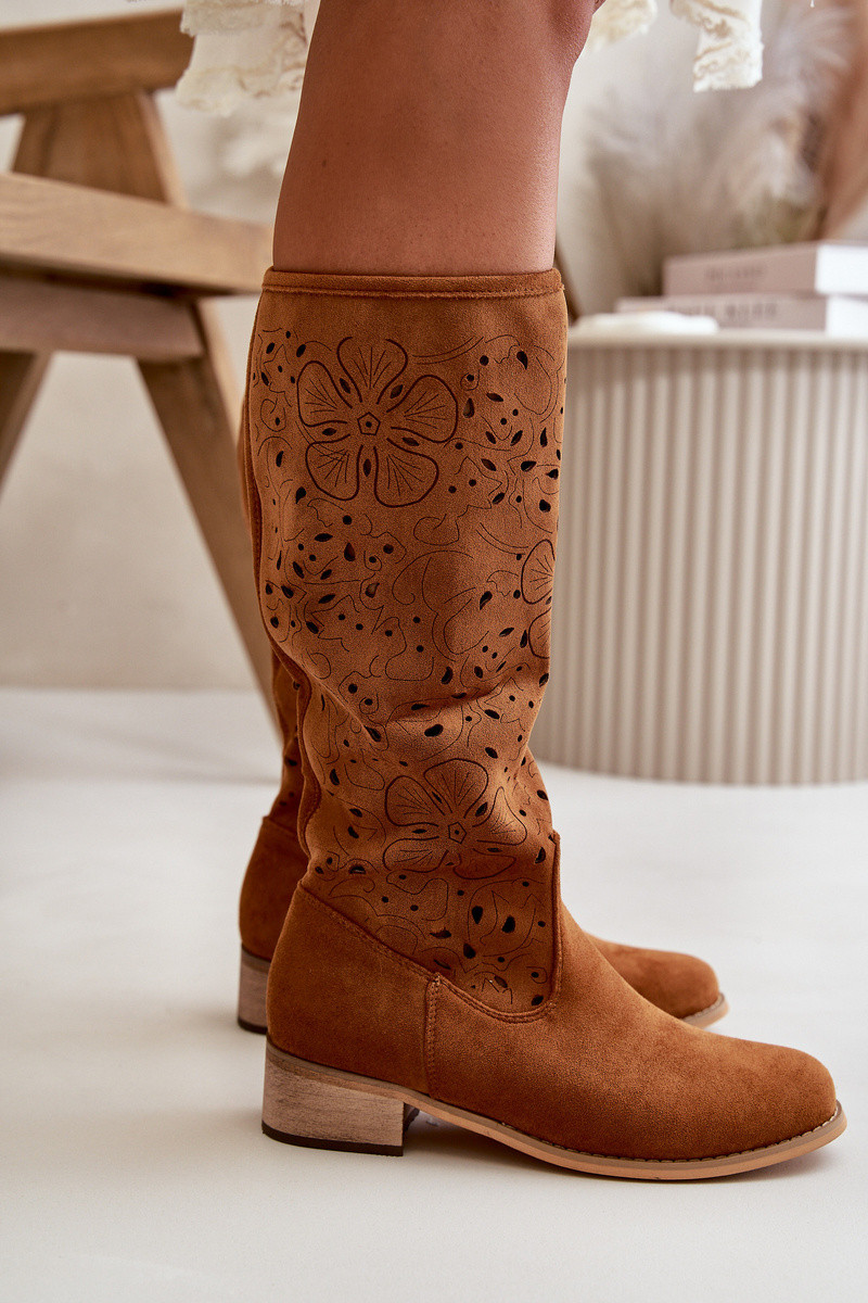 Aukude elementidega naiste kõrge säärega saapad madala kontsaga kunstnahast tõmblukuga pruunis värvi Orchides