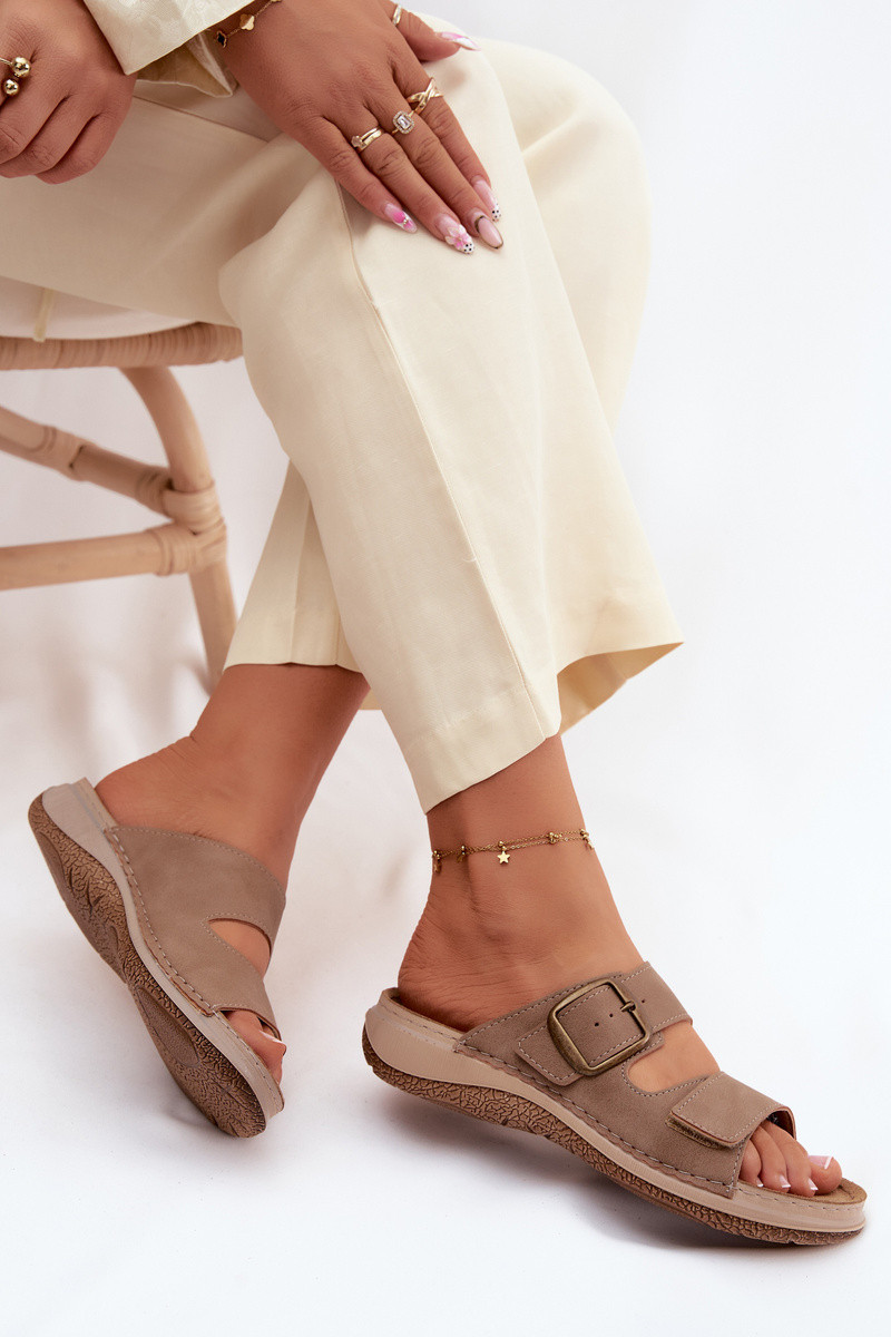 Naiste sussid klambritega ja kleepuva sulgemisega pruunis värvitoonis