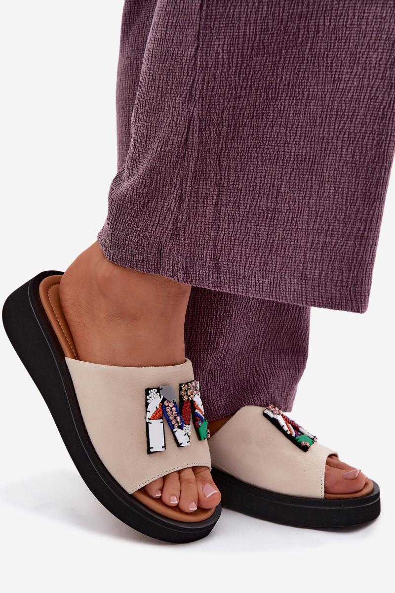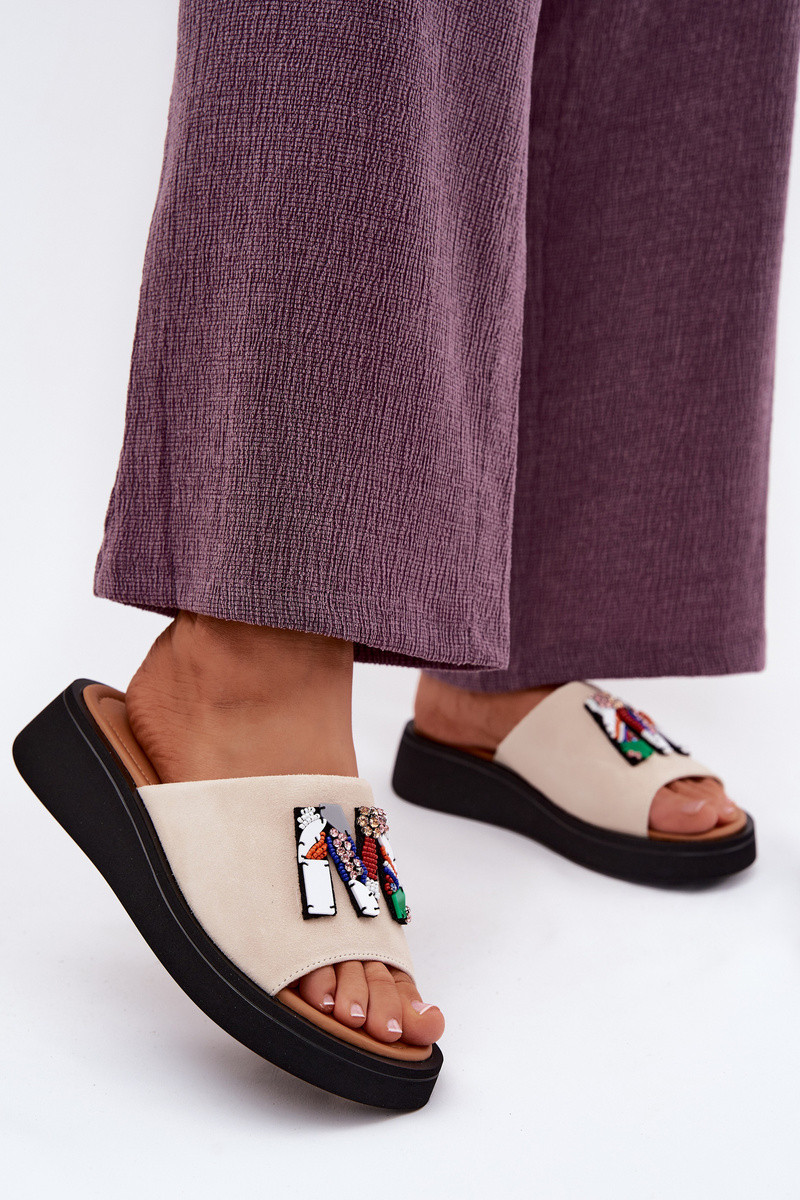 Pealhk naiste seemisnahksed sussid kaunistustega platvormiga Vinceza 66942 beeži värvi